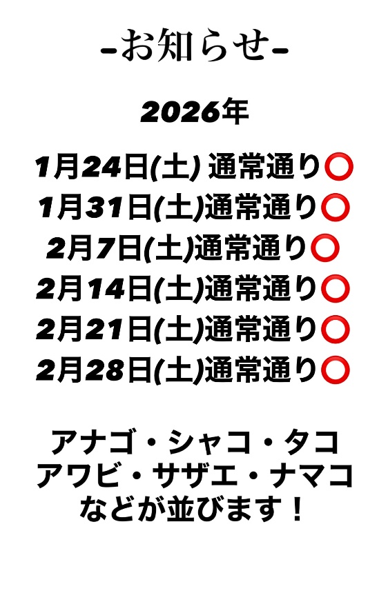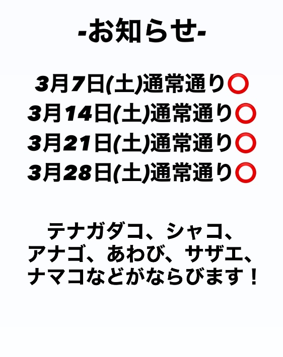 | 主な魚 | エビ類 ワタリガニ ヒラメ・カレイ シャコ アナゴ アワビ サザエ アサリ ナマコ サワラ タチウオ ※尚、漁期でその都度販売する魚種は変わります。 ご了承ください。 |